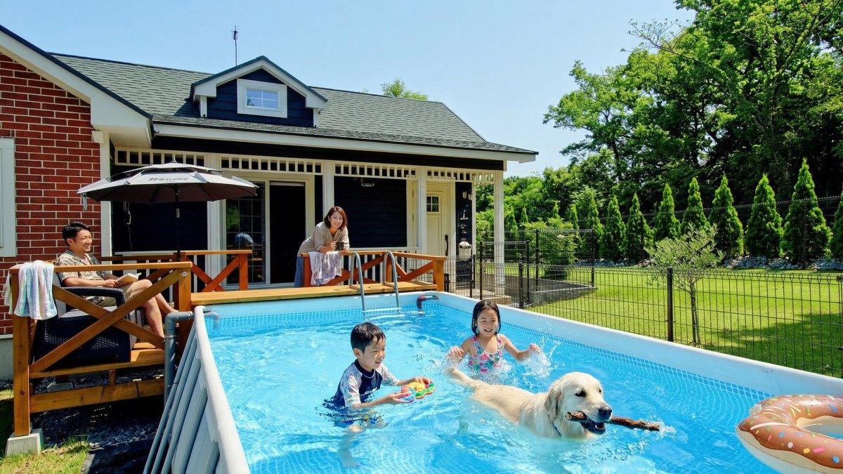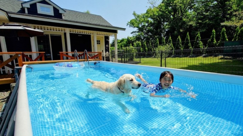 伊豆に来ても、 散歩だけだと少し物足りなさそうな顔をする。 その姿を見るたびに、 「もっと遊べたらいいのに」と思っていました。 だったら、 思いきり泳げる場所をつくろう。 犬と一緒に入れる温水プールと、 すぐそばで走れるドッグラン を用意しました。