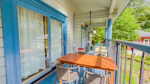 淡いブルーのフィンランドログハウス。魅力は使いやすい平屋の間取りとバーモントキャスティングの薪ストーブ。そして八ヶ岳の森で楽しむバレルサウナです。