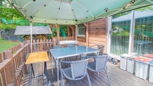 庭 | 【ウッドデッキ】ジャグジーバス・タープテント・BBQテーブル・イス・ライト ※積雪のため11月~3月はご利用いただけません。 【ドッグラン】ハンモック |