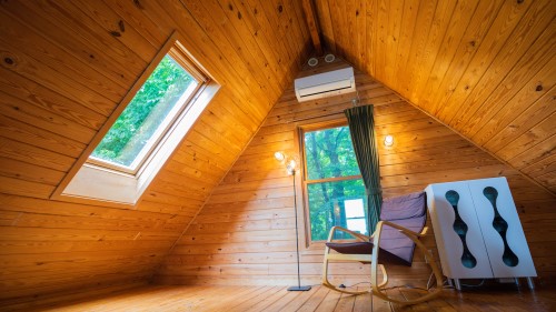 名前の通り大きなヤマザクラのあるログハウス。吹き抜けのある広々とした空間には薪ストーブがあり、ウッドデッキには森林浴が楽しめる温水ジャグジーも完備しています。ワンちゃんが大喜びの傾斜があるドッグランは人工芝なので雨上がりでも快適に楽しめます。