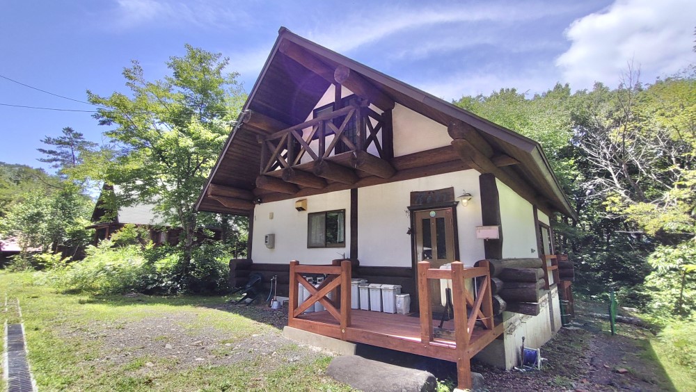 吹き抜けの天井が心地いいハンドカットのログハウスです。後方には木陰の気持ちいドッグランとその中央にオープンデッキがあります。 |
