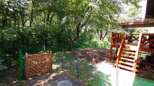広いウッドデッキの向こうに広がる広葉樹の林とドッグランは人目も遮られているので、ワンちゃんと共にゆったりお寛ぎいただけます。