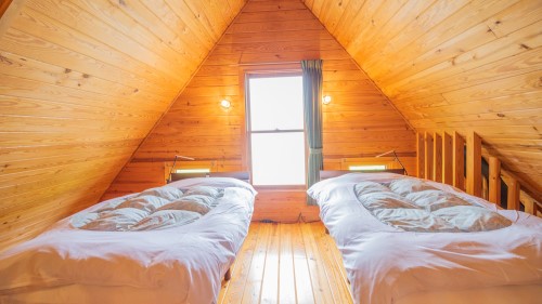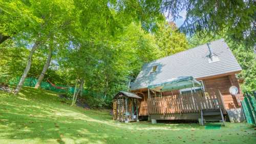 名前の通り大きなヤマザクラのあるログハウス。吹き抜けのある広々とした空間には薪ストーブがあり、ウッドデッキには森林浴が楽しめる温水ジャグジーも完備しています。ワンちゃんが大喜びの傾斜があるドッグランは人工芝なので雨上がりでも快適に楽しめます。